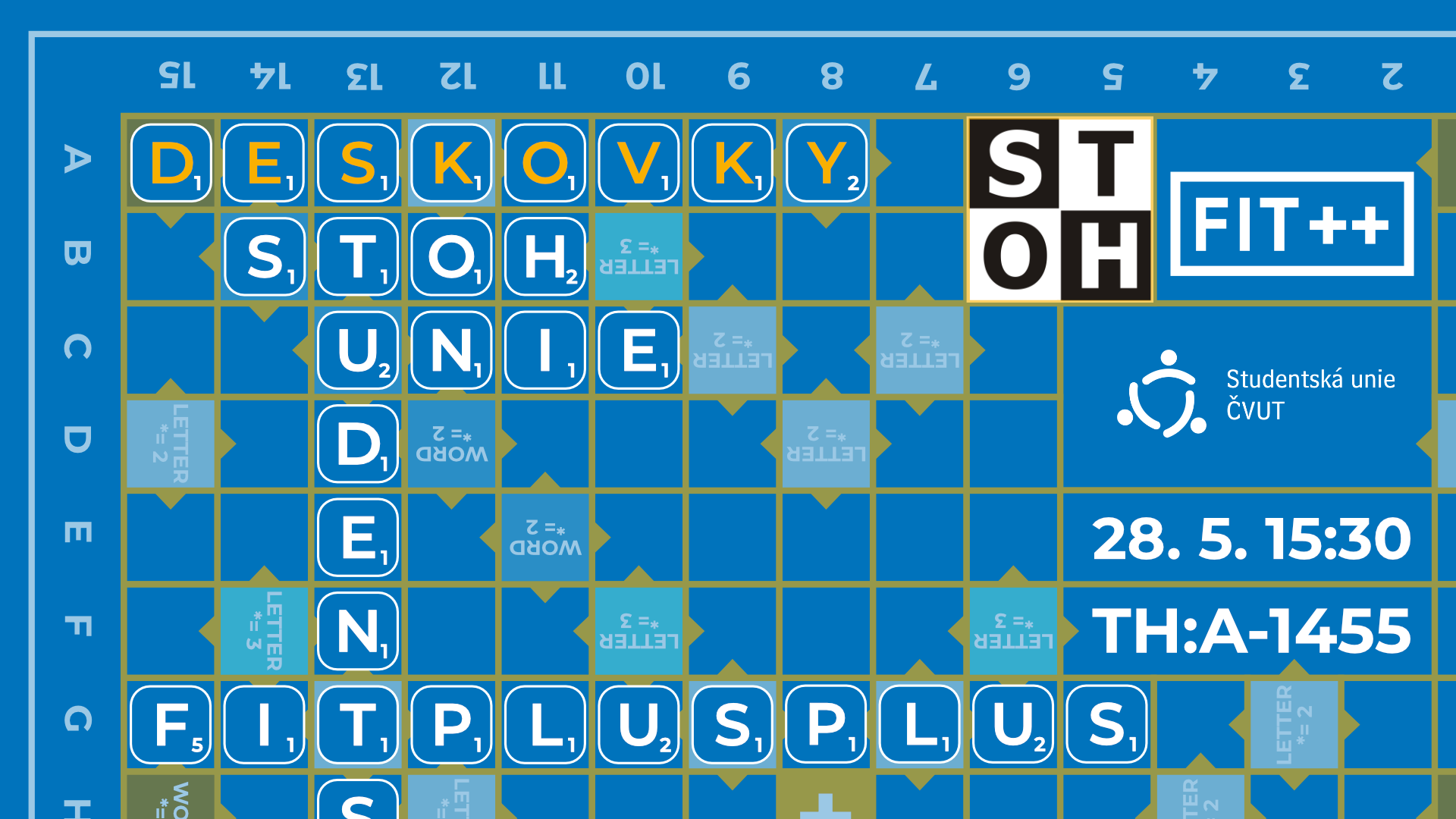 Že zkouškové ještě ani nezačalo, a ty už se od něj potřebuješ odreagovat? Neboj se, máme to stejně, a tak jsme na 28. 5. od 15:30 naplánovali Deskovky, kam si si můžeš přijít odpočinout, zahrát hry s kamarády a obecně zapomenout že nějaké zkouškové vůbec probíhá.