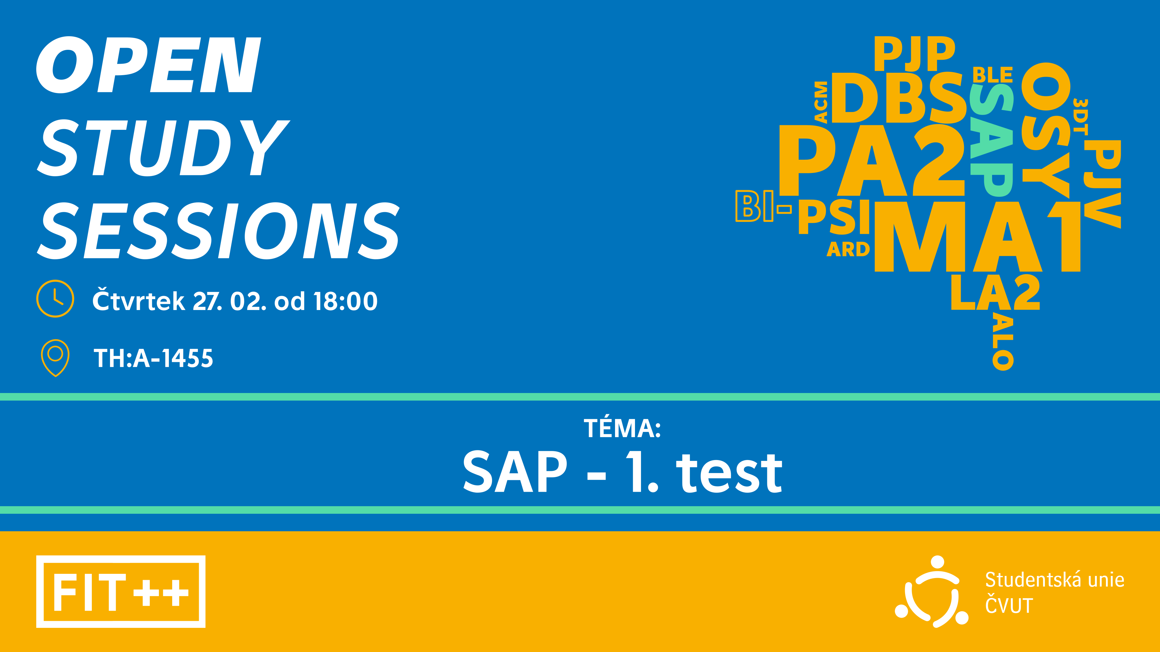 Bojíš se prvního testu semestru a nevíš co očekávat, nebo si myslíš že máš mezery a chceš se na něco zeptat? Není čeho se bát, stačí přijít na čtvrteční Open Study Session, kde se i od cvičících SAPů dozvíš co očekávat a na co se připravit. Rádi i odpovíme na všechny možné dotazy, ať už o SAPech či jiném předmětu! 💻